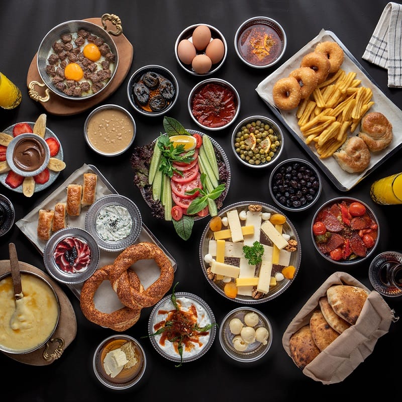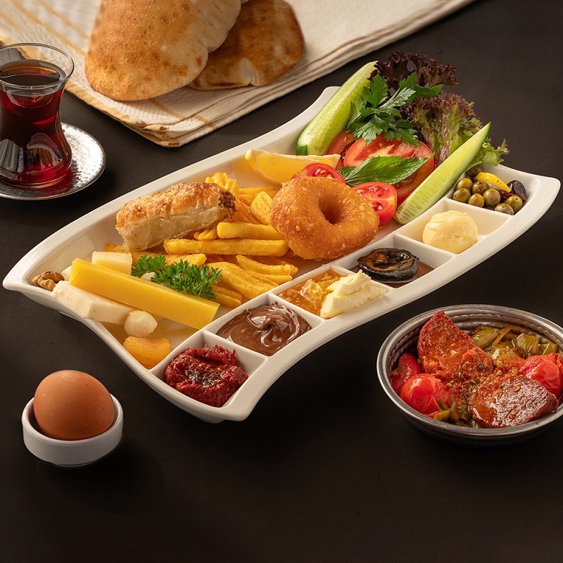 (Kişi başı ücretlendirilmektedir) Kahvaltı içeriği; Ezine peyniri, İzmir tulum peyniri, Kars kaşar peyniri, misket peyniri, ceviz, kuru kayısı, grissini, kahvaltılık domates, Çengelköy salatalık, roka, kuzu kulağı, bal, kaymak, tereyağı, Hatay Halhal zeytin, Gemlik siyah zeytin, fıstık ezmesi, ceviz reçeli, acuka (baharatlı reçelli sos), labne, lor peyniri, haşlanmış yumurta, simit, baharatlı zeytinyağı soslu kahvaltılık sucuk, pişi, parmak patates, patlıcanlı börek, kıymalı börek, biber kızartma, fondü, puf ekmek ve demlik çaydır.