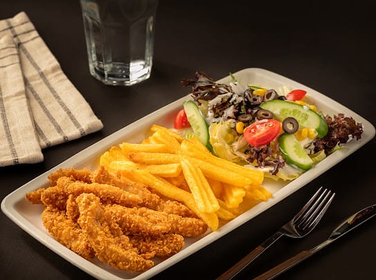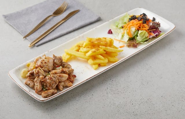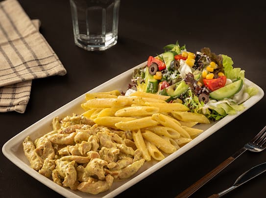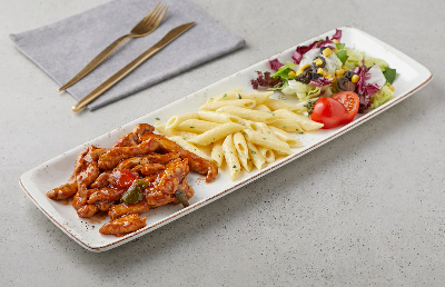 Şefin özel barbekü sosu ile hazırlanan efsane bir lezzet, makarna ve salata ile servis edilir.