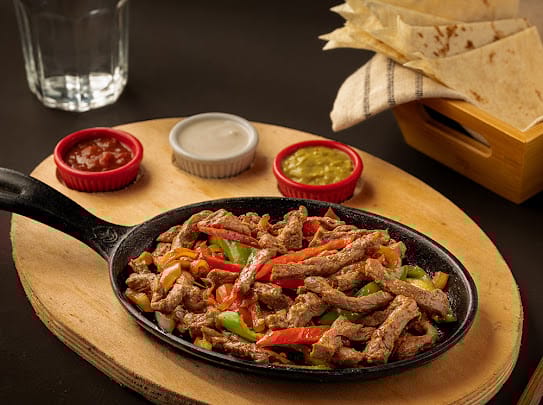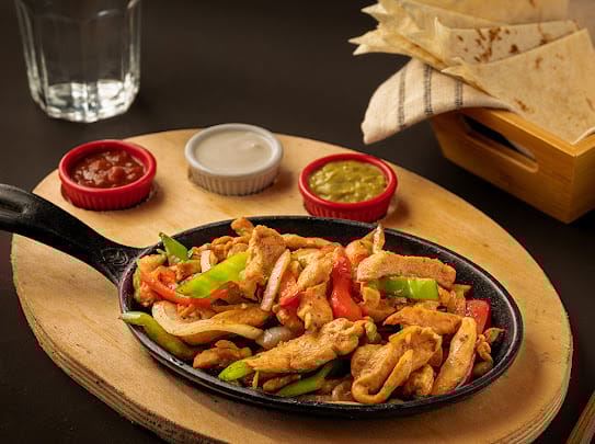 Kırmızı ve yeşil biber, soğan, Meksika fasulyesi ve jalapeno biber, tortilla cips, salata ve özel soslarla servis edilir.