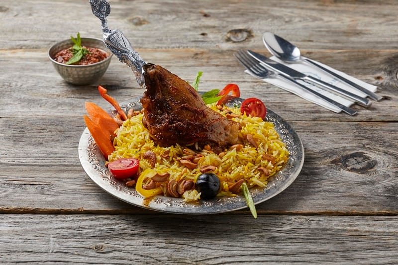 Baharatlı basmati pirinç ile hazırlanan kuzu incik, meze ile servis edilir.