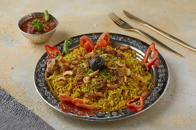 Baharatlı basmati pirinç ile hazırlanan tavuk pirzola, meze ile servis edilir.