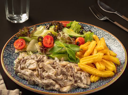 Yeşil köy biberi ve mantar ile hazırlanan efsane bir lezzet, makarna ve salata ile servis edilir.