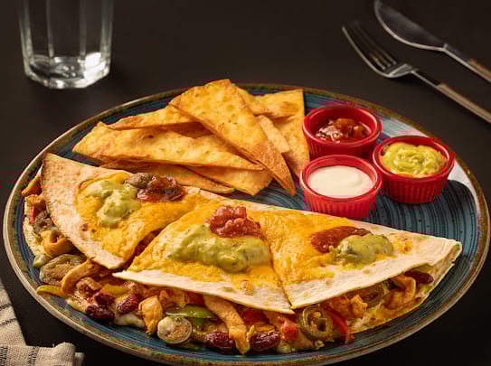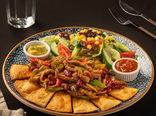 Kırmızı ve yeşil biber, soğan, Meksika fasulyesi ve jalapeno biber; tortilla cips, salata ve özel soslarla servis edilir.
