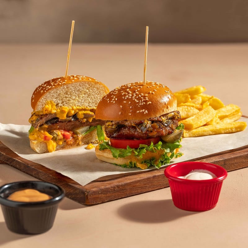 Karamelize soğan, mantar, jalapeno biber, mozzarella peyniri, patates kızartması ve özel soslarla servis edilir.