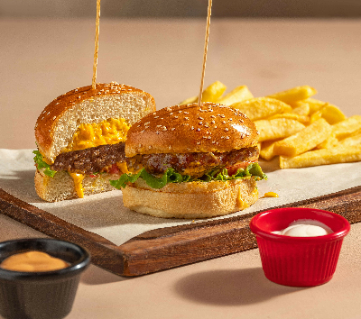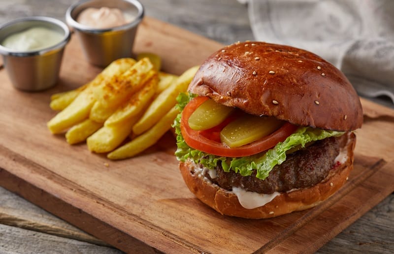 El yapımı hamburger köftesi, yeşillik, turşu, domates, patates ve soslarla servis edilir.