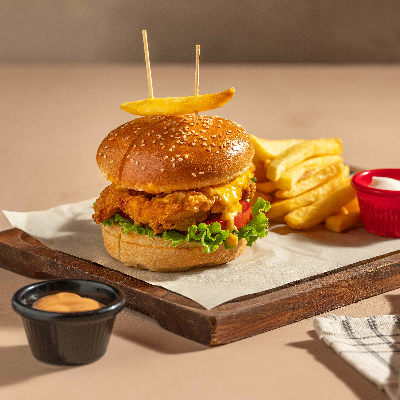 Panelenmiş çıtır tavuk; burger sos, domates, turşu, marul, patates kızartması ve özel soslarla servis edilir.