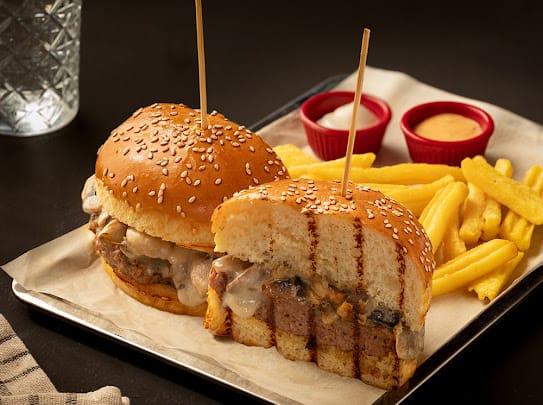 Karamelize mantar ve mozzarella peyniri, patates kızartması ve özel soslarla servis edilir.
