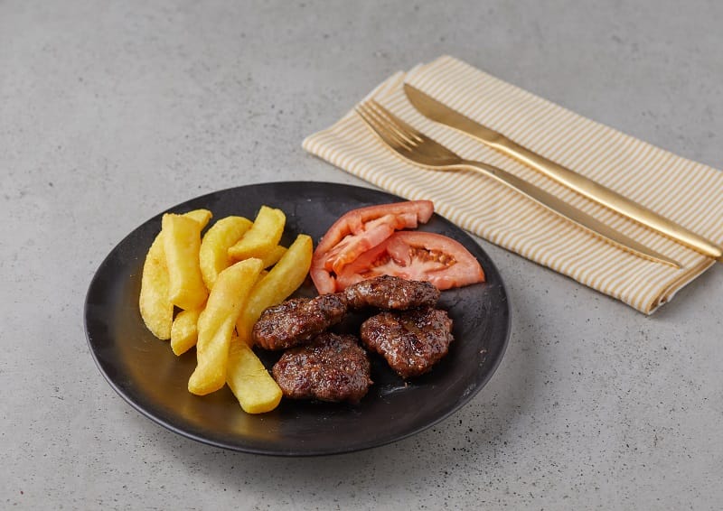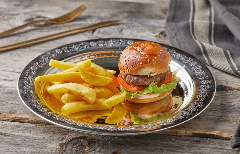 Ev yapımı burger köftesi, kıvırcık marul, domates, turşu, patates kızartması ve 1 adet içecek ile servis edilir.